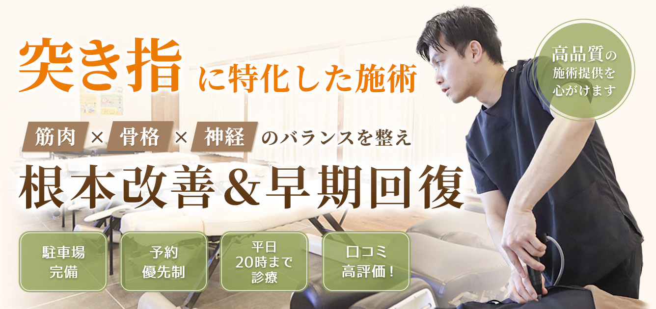 <p>指の筋緊張を取り血行を改善するだけでなく、筋肉調整治療、背骨骨盤矯正、神経電圧治療器による治療を行うことで痛みの原因を元から改善することが可能です。手や指に負担がかかりにくい日常生活の指導やリハビリ計画も立て、一日も早い回復を目指します。</p>