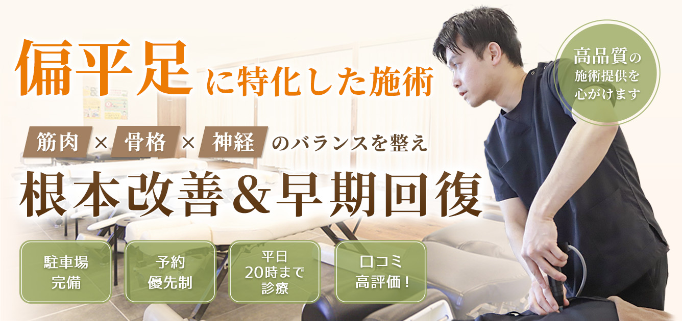 盛岡市のふくろう整骨院では、足裏だけをサポートするインソールやマッサージといった一時的な対処ではなく、骨格・筋肉・神経のバランスを整える「BNM施術」を行い、偏平足の原因となる全身のゆがみや動きのクセにアプローチします。骨盤・股関節・膝・足首まで整えることで、足裏アーチの機能を回復させ、再発しにくい身体づくりをサポートします。
