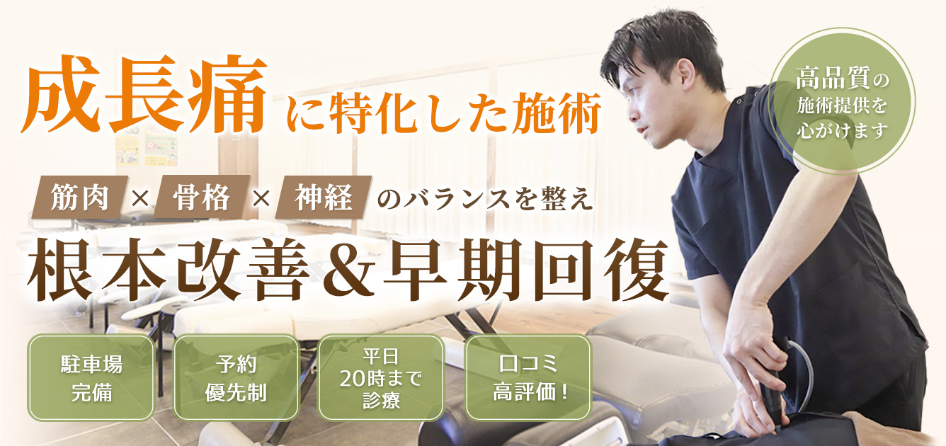 身体のバランスや重心のズレ、背骨や骨盤のゆがみによって成長痛が発生することが多いため、身体のバランスを崩さない生活が大切です。小さなお子様の場合は、保護者の方がサポートしてあげましょう。また、日常生活の姿勢管理も大切です。