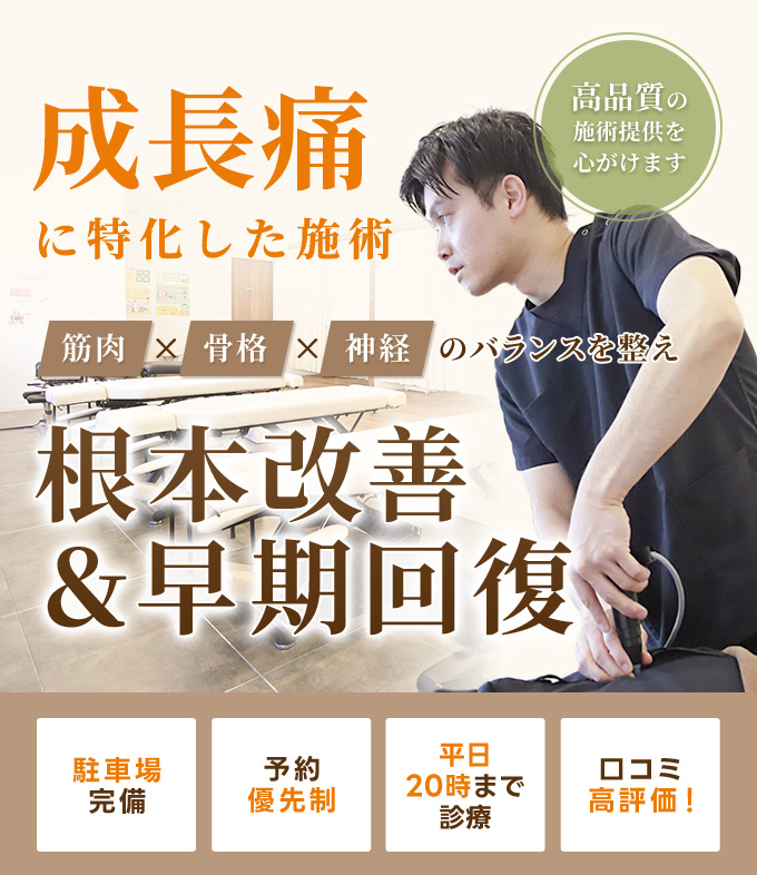 また、筋肉調整を行い、筋肉を柔軟な状態にしておくことも成長痛を防ぐうえで重要です。