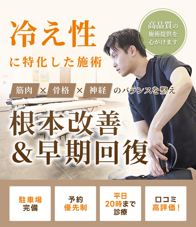 手技で固まった筋肉を緩めて血流を改善し、ゆがんだ骨格を正しい状態へ調整し、うっ滞が起きにくい状態へ導いて血液の循環を促します。最後に神経調整施術で自律神経を整えていきます。