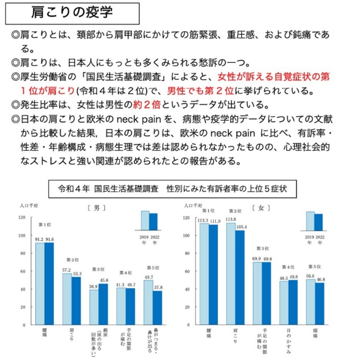 厚生労働省の調査によると、肩こりは女性の自覚症状で第1位、男性でも第2位に挙げられるほど、多くの方が悩んでいる不調です。