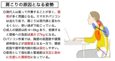 実は、大人の頭の重さは約4〜6kg。前に傾くことで首や肩に最大27kg分の負担がかかると言われています。
