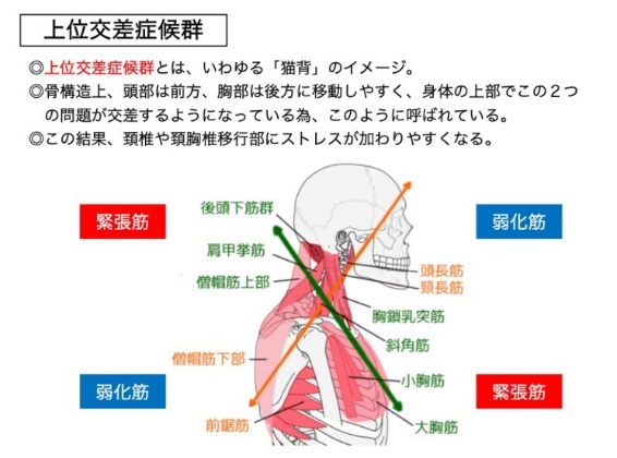 これは「上位交差症候群」と呼ばれる状態で、筋肉のバランスが崩れて肩や首に負担が集中し、コリや張りを感じやすくなるのです。