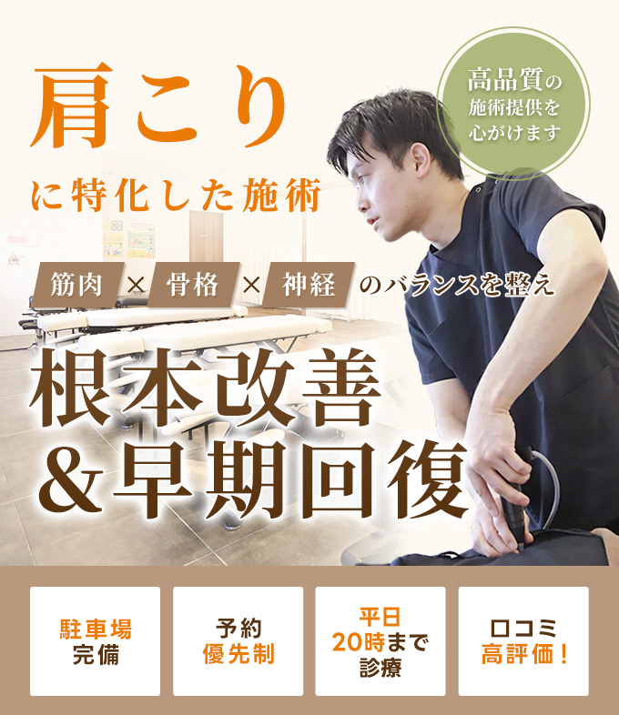 盛岡市のふくろう整骨院では、カイロプラクティックの理論をベースに、骨格・筋肉・神経の調和を重視した独自の【BNM施術】を行っています。ただ硬くなった筋肉をほぐすだけではなく、全身の構造的なバランスを整えることで、薬や電気に頼らず、肩こりを根本から改善へ導くことを目的としています。他院で改善しなかった慢性的な肩こりにも対応しています。