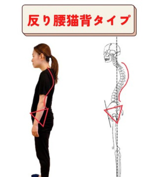「反り腰+猫背」タイプの姿勢です。このような方は、骨盤が前に傾き、腰が反り、上半身は前に丸くなるクセがあります。