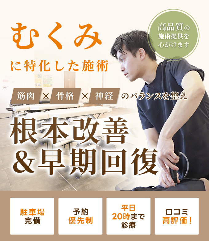 <p>筋肉をほぐし、やわらげ、矯正によって筋肉や骨格のゆがみを改善していきます。全身のバランスを整えることで自律神経を正常化し、血行を促すことで冷えやむくみの原因を取り除きます。</p>