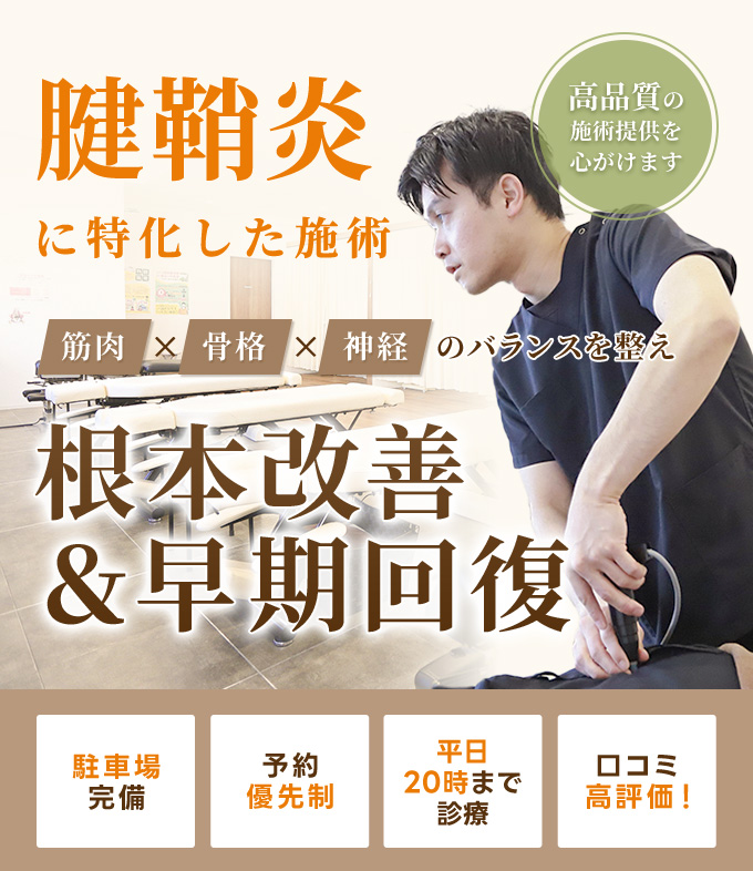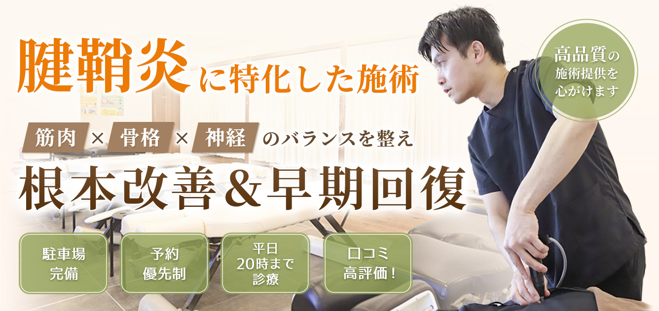<p>手や手首の筋緊張をほぐして血行を改善すると同時に、筋肉調整治療、背骨骨盤矯正、神経電圧治療器による治療を行うことで痛みの原因を元から改善することが可能です。腱鞘に負担がかかりにくい日常生活の指導やリハビリ計画も立て、一日も早い回復を目指します。</p>